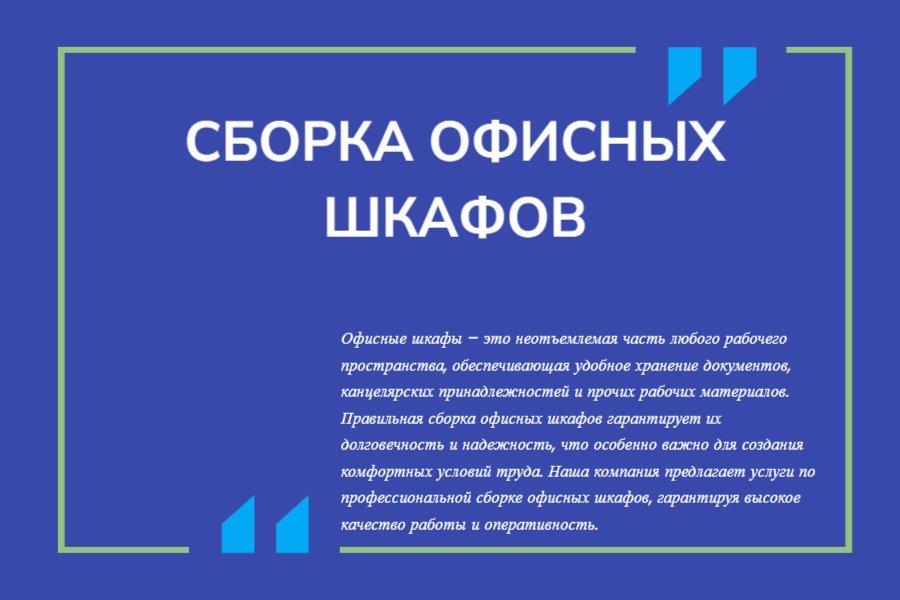 - Качество и надежность. Мы используем только проверенные инструменты и крепежные материалы, что гарантирует прочность и долговечность собранной мебели. Ваши офисные шкафы будут установлены с точностью, чтобы избежать перекосов, проблем с дверями и выдвижными ящиками.