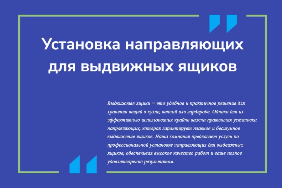 - Качество и точность. Мы используем только профессиональные инструменты и качественные направляющие, что гарантирует долговечность и надежность собранной мебели. Все направляющие будут установлены с максимальной точностью, обеспечивая легкость и плавность в эксплуатации.